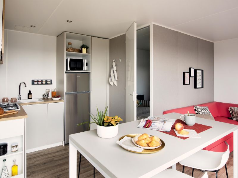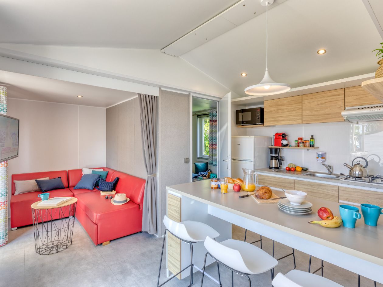 Le mobilhome Privilège 2/3 chambres avec son grand séjour, offre un espace confortable pouvant accueillir 5 personnes. Ce modèle 2 chambres grand confort de 31 m², bénéficie d’un atout tendance, une cuisine intégrée avec îlot. Le salon est modulable en 3ème chambre ouvrant sur une terrasse couverte surélevée en bois. Il est disponible à la location à la semaine, à la quinzaine ou au week-end (2 nuitées).