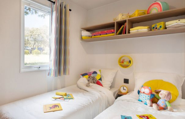 La chambre parentale est équipée d'un lit double 140x190, avec suffisamment de rangements. Celle du mobil-home Loggia est aménagée avec un emplacement pour lit-bébé, parfait pour les familles avec jeunes enfants. Avec deux lits simples, la deuxième chambre est pensée pour les enfants ou les amis.