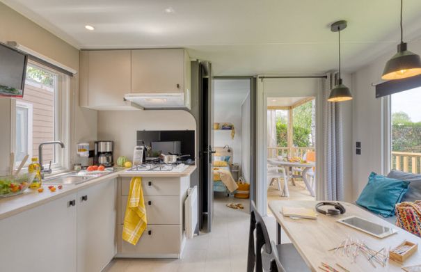 Tous nos modèles proposent une cuisine équipée, un coin repas et un espace salon avec banquette. Le Loggia est équipé d'une baie panoramique dans le salon, apportant une belle luminosité naturelle supplémentaire à l’intérieur et créant une agréable sensation d’espace. Dans le mobil-home de 30 m², vous profiterez d’un séjour plus grand.