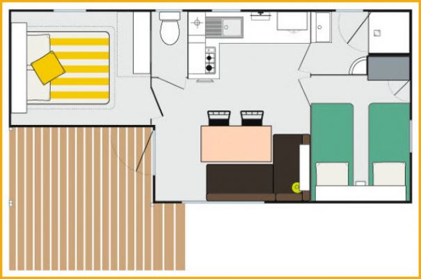 Avec une superficie de 24 m², il est équipé de 2 chambres séparées par le coin séjour et d'une terrasse surélevée semi-couverte. Disponible à la location à la semaine, à la quinzaine ou au week-end (2 nuitées).